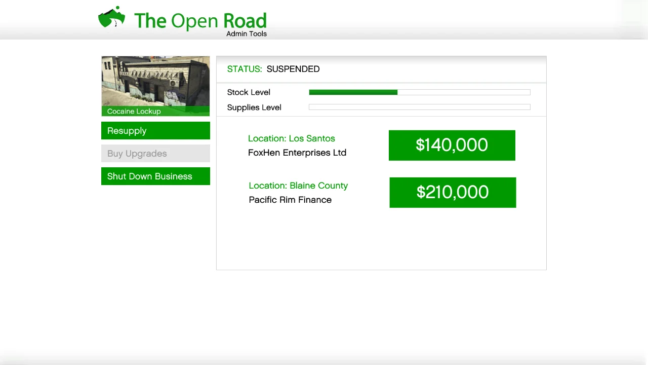 Once your Cocaine Lockup runs out of supplies, the business is suspended until you steal or buy supplies.